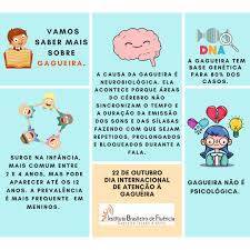 O Dia Internacional de Atenção à Gagueira é comemorado no dia 22 de outubro e tem como objetivo informar, conscientizar e educar a população sobre a gagueira. A gagueira é um distúrbio neuro biológico que afeta a fala e é caracterizada por: Repetição de sons e sílabas, Paradas involuntárias, Prolongamento de sons. A gagueira não é um problema psicológico, mas sim um transtorno de fluência da fala. A hereditariedade é um dos fatores relacionados à gagueira.