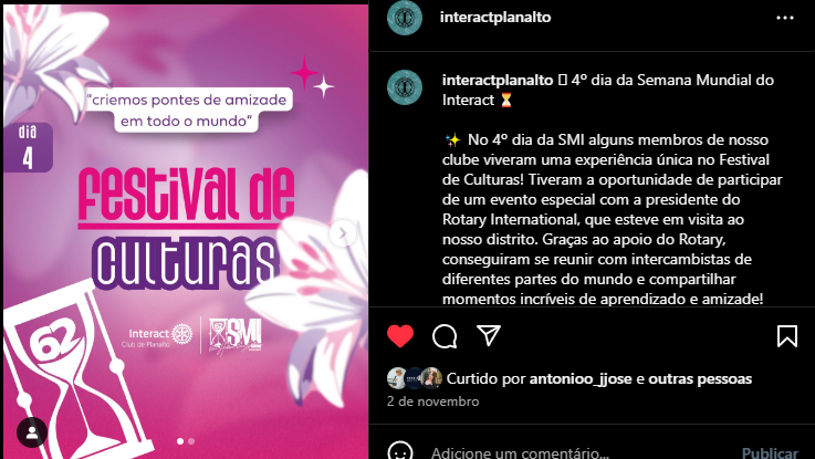 Após a postagem, os membros discutiram o impacto cultural da experiência compartilhada, recebendo feedback positivo durante a reunião seguinte. A publicação teve curtidas e comentários, fortalecendo a imagem do clube como um espaço de intercâmbio cultural.