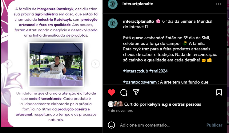 Após a publicação, os membros discutiram o impacto positivo do projeto em reunião, destacando a importância de valorizar o trabalho dos agricultores. A publicação gerou engajamento e recebeu comentários positivos da comunidade, fortalecendo a presença do clube na valorização do comércio local.