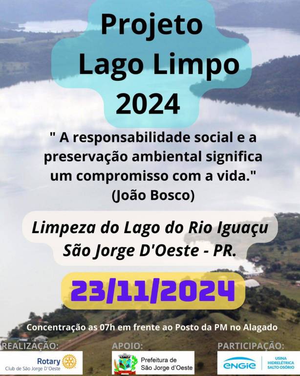 Nesta edição do Lago Limpo o Rotary Club de São Jorge D’Oeste contou com o apoio da Prefeitura de São Jorge D’Oeste, Engie, Verdes Lagos Soluções Ambientais, Policia Militar Ambiental e COASUL.