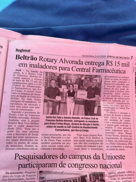 A entrega foi realizado pelos companheiros Isaías Dal Zotto e o presidente do Rotary Club de Francisco Beltrão-Alvorada, Antonio Andretta Neto. Esse projeto vem desde 2016. “Esse ano a gente fez uma parceria com a Secretaria de Saúde para que esses equipamentos sejam distribuídos em todos os postos de saúde do município. Quando as pessoas contribuem com as nossas promoções, que são o Jantar Premiado e o baile do Porca Pipa, estão ajudando em projetos sociais como esse”, comenta o presidente.