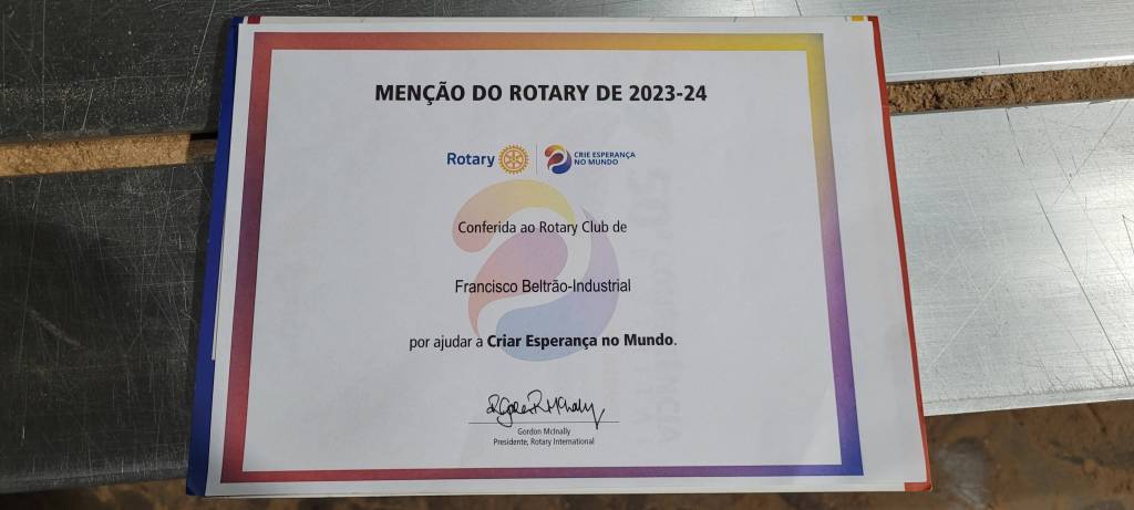 No início da noite de quinta-feira, dia 5 de dezembro, o governador do Distrito 4640 no ano rotário 2023/24, Antônio da Caz, entregou para o ex-presidente do Rotary Club de Francisco Beltrão Industrial, Eduardo da Caz, a Menção do Rotary International, conferida pelo presidente Gordon McInally. Essa honraria foi concedida ao clube por sua contribuição em ajudar a criar esperança no mundo.