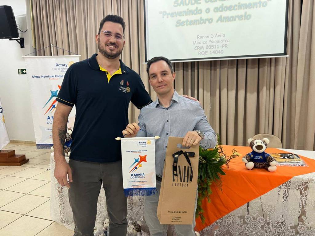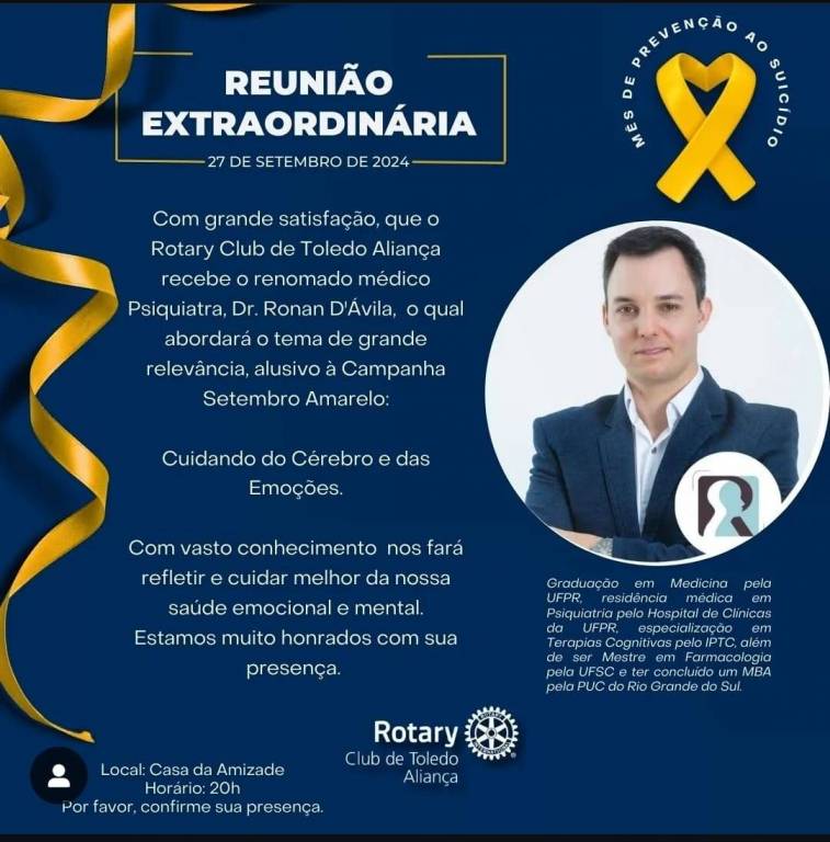 Na última sexta-feira, 27 de setembro de 2024, o Rotary Club de Toledo – Aliança realizou uma reunião extraordinária na Casa da Amizade, com um tema de extrema relevância para a campanha do Setembro Amarelo: a prevenção ao adoecimento emocional e mental. O evento foi ministrado pelo renomado psiquiatra Dr. Ronan D'Ávila, que abordou o tema “Cuidando do Cérebro e das Emoções”.