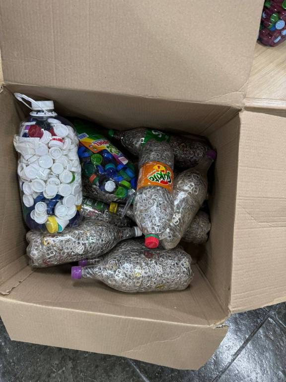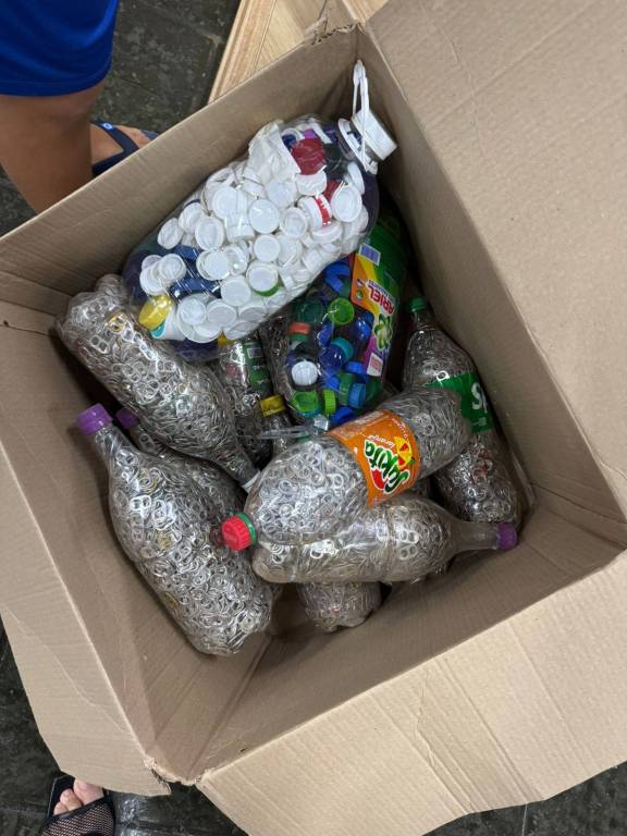 Durante o encontro, foram entregues lacres de latinhas e tampinhas de PETs, materiais arrecadados pelo Rotary Club de Francisco Beltrão Industrial para ações solidárias.