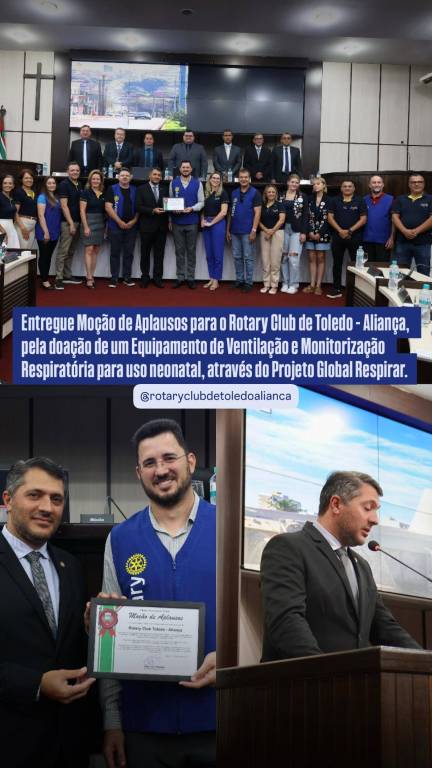 Com alegria compartilhamos a Moção de Aplausos da Câmara Municipal de Toledo, através da indicação do Vereador Jairo Cerbarro, ao Rotary Club de Toledo Aliança, como reconhecimento da doação de aparelho de ventilação à UTI Neonatal do Hospital Bom Jesus, equipamento este, que atenderá toda cidade e região de abrangência, salvado vidas de recém nascidos extremos.