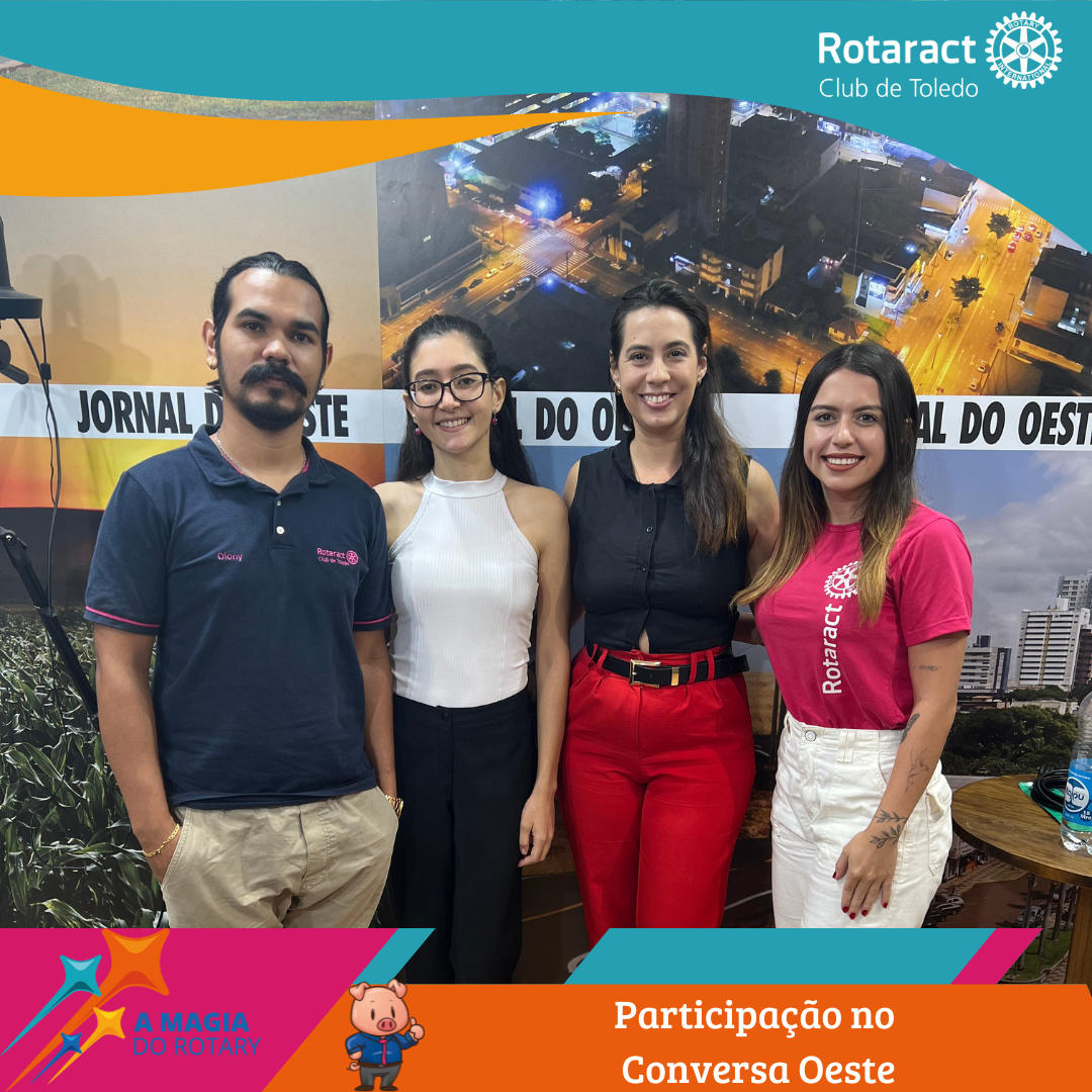 Na última segunda-feira (17), o Rotaract Club de Toledo marcou presença no Podcast Conversa Oeste, do Jornal do Oeste, conduzido pela jornalista Joana Magnabosco. Durante a entrevista, os representantes do clube compartilharam a missão do Rotaract, destacaram o impacto dos projetos na comunidade e aproveitaram a oportunidade para convidar novos interessados a conhecerem mais sobre o movimento.