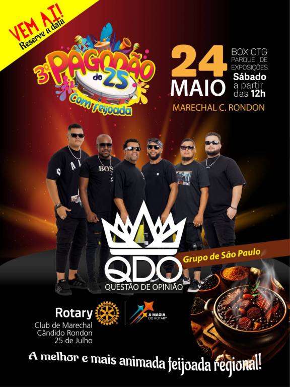 A 3ª edição da Feijoada com Pagode promovida pelo Rotary 25 de Julho, de Marechal Cândido Rondon, já tem data marcada: será no dia 24 de maio, no Parque de Exposições, a partir das 12 horas.