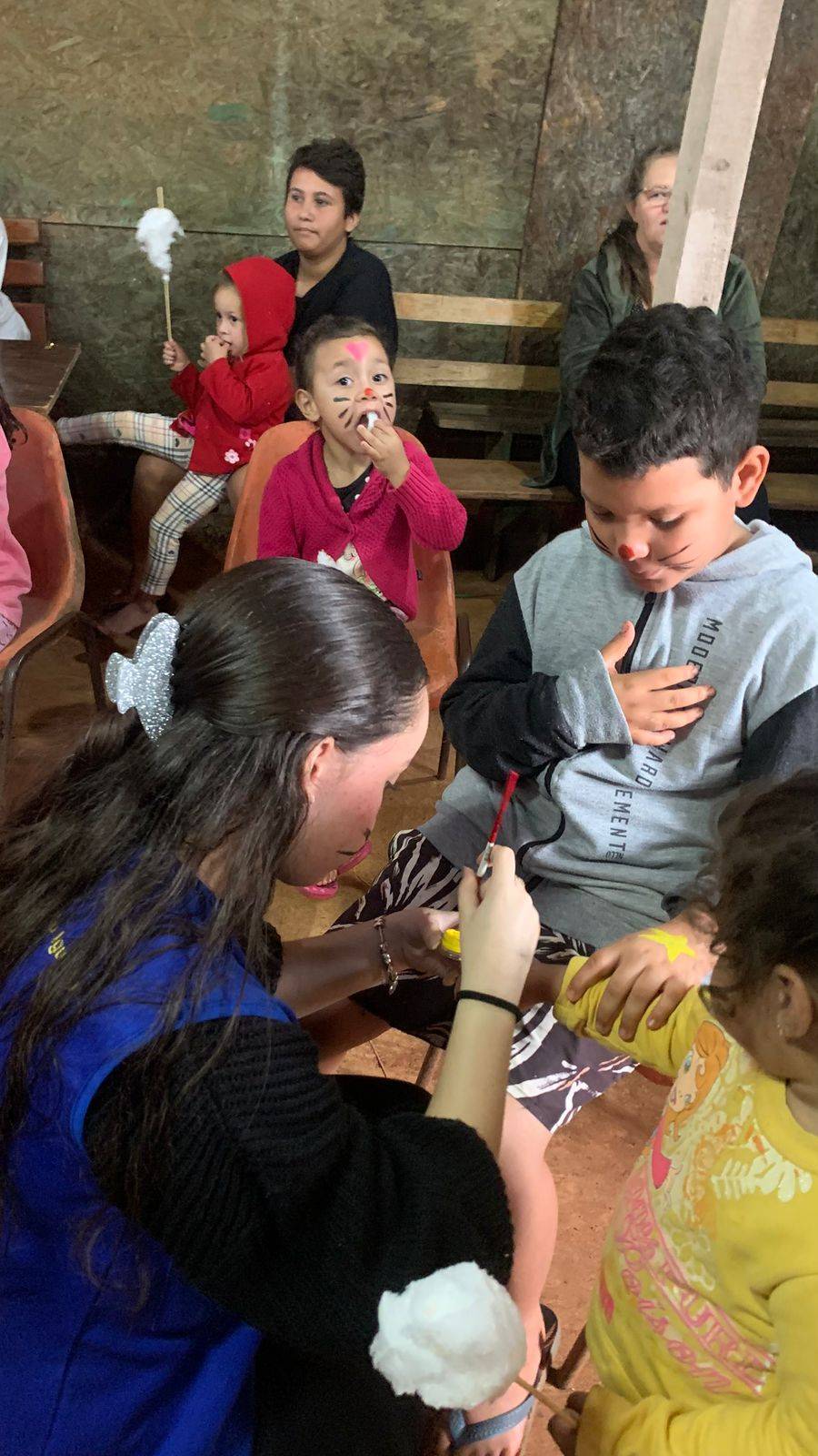 Entregamos lembrancinhas, fizemos pintura facial e distribuímos algodão doce para as crianças, que brilharam de felicidade! Cada sorriso e cada abraço foi um presente para nós, e nos encheu o coração de gratidão e amor!