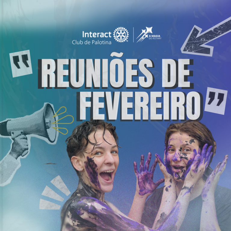 A imagem é um cartaz digital do Interact Club de Palotina, destacando as "Reuniões de Fevereiro". O fundo tem um degradê que vai do azul ao roxo, criando um clima vibrante. O texto "REUNIÕES DE FEVEREIRO" está em letras grandes e brancas com sombra preta, dando destaque à mensagem principal.