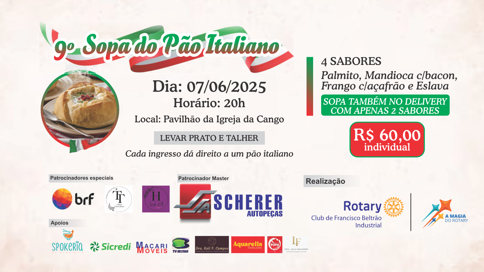 No sábado, 07 de junho de 2025, o Rotary Club de Francisco Beltrão – Industrial realiza a 9ª edição da tradicional Sopa no Pão Italiano, um evento beneficente que já se tornou referência na cidade. O jantar será realizado no Pavilhão da Igreja da Cango, a partir das 20h.
