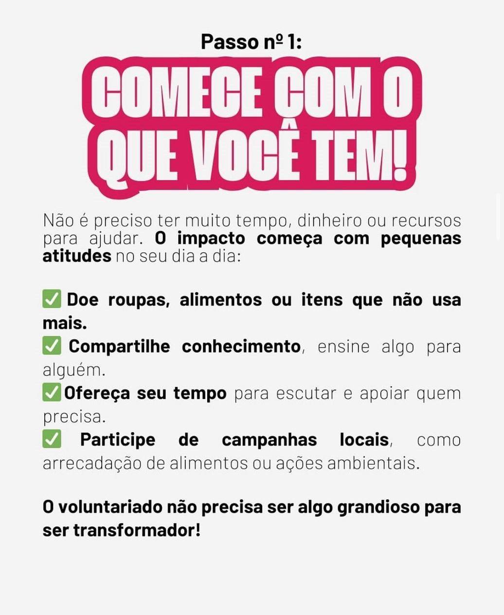 Você já parou para pensar no impacto que uma única ação pode ter? Às vezes, tudo o que o mundo precisa é que alguém tome a iniciativa. E esse alguém pode ser você! Seja ajudando um amigo, apoiando um projeto local ou se envolvendo em algo maior, toda mudança começa com um primeiro passo.