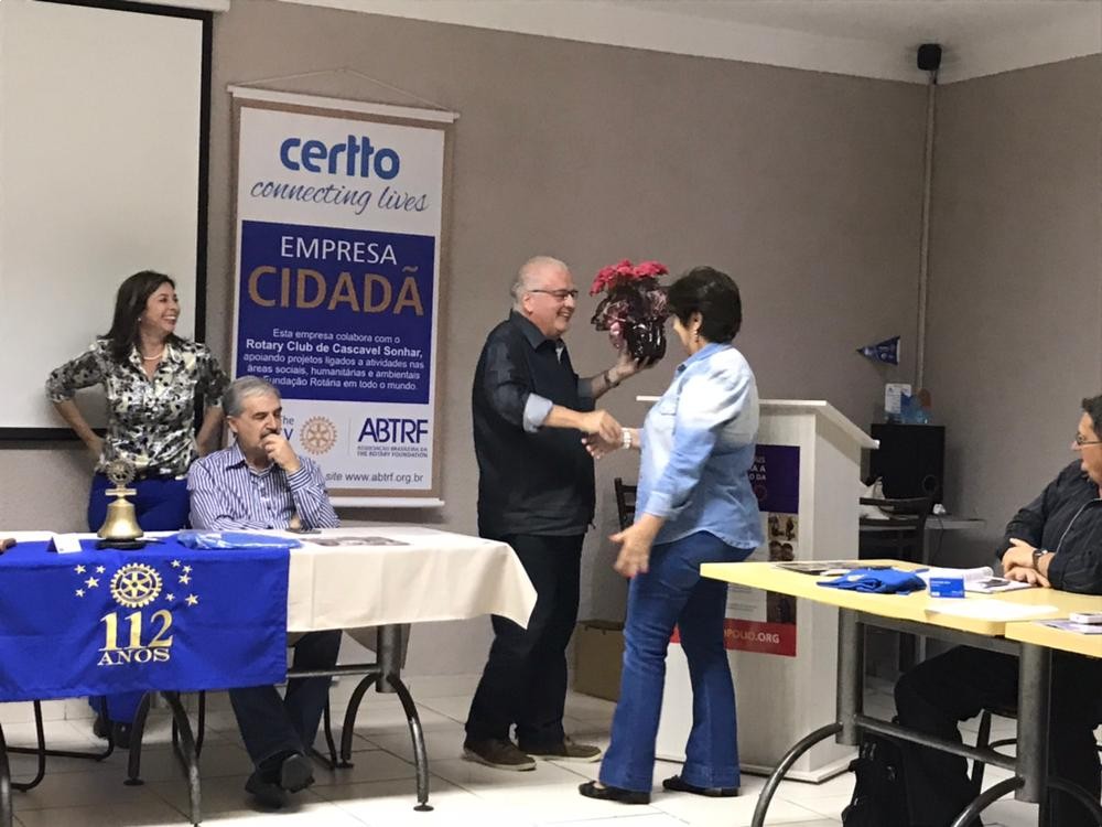 Na última reunião ordinária do Rotary Club de Cascavel-Sonhar, a companheira Daisy Azevedo foi homenagedada. Roberto Pelizzetti do Rotary Club de Cascavel-União, seu padrinho, participou da reunião para fazer a homenagem a nossa companheira. Daisy é sócia-fundadora do clube, muito ativa, já assumiu a secretaria e o protocolo e é sempre muito participativa nos projetos, ações e cuidadosa com as presenças nas reuniões - sempre recuperando quando precisa faltar. Além de tudo isso, a companheira deu um show no XII Recital de Canto do último dia 18 no Teatro Municipal de Cascavel. Daisy, o clube só se orgulha de ter você no nosso quadro associativo!!