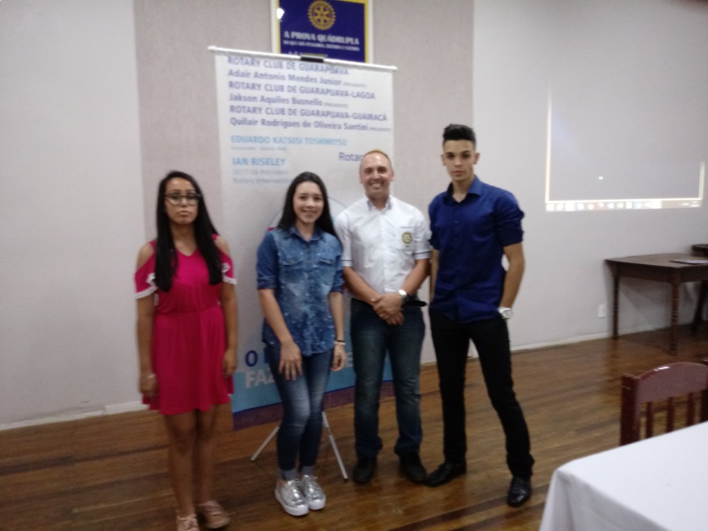 O ROTARY CLUB GUARAPUAVA LAGOA PREMIOU, ATRAVÉS DE RECURSOS ARRECADADOS NA 3ª EXPOFLOR, NESTA TERÇA-FEIRA (DIA 12 DE DEMBRO DE 2017) OS ALUNOS QUE SE DESTACARAM NO PROJETO PROFISSIONAL POR UM DIA. O PROJETO QUE TEM MAIS DE DEZ ANOS E QUE TEM SIDO REALIZADO PELO CLUBE JUNTO AS ESCOLAS DO MUNICÍPIO DE GUARAPUAVA CONSISTINDO EM FOMENTAR NOS JOVENS DOS 3º ANOS DO ENSINO MÉDIO A IMPORTÂNCIA DAS PROFISSÕES E O INCENTIVO AO ESTUDO PARA O ALCANCE DO SEU OBJETIVO. CONSISTE AINDA O PROJETO EM PREMIAR EM DINHEIRO AS TRÊS REDAÇÕES QUE SE DESTACARAM SOBRE O TEMA, ALÉM DE LEVAR OS ESTUDANTES A PASSAR UM DIA COM OS PROFISSIONAIS DA ÁREA QUE ELES ESCOLHERAM PARA ESCREVER .