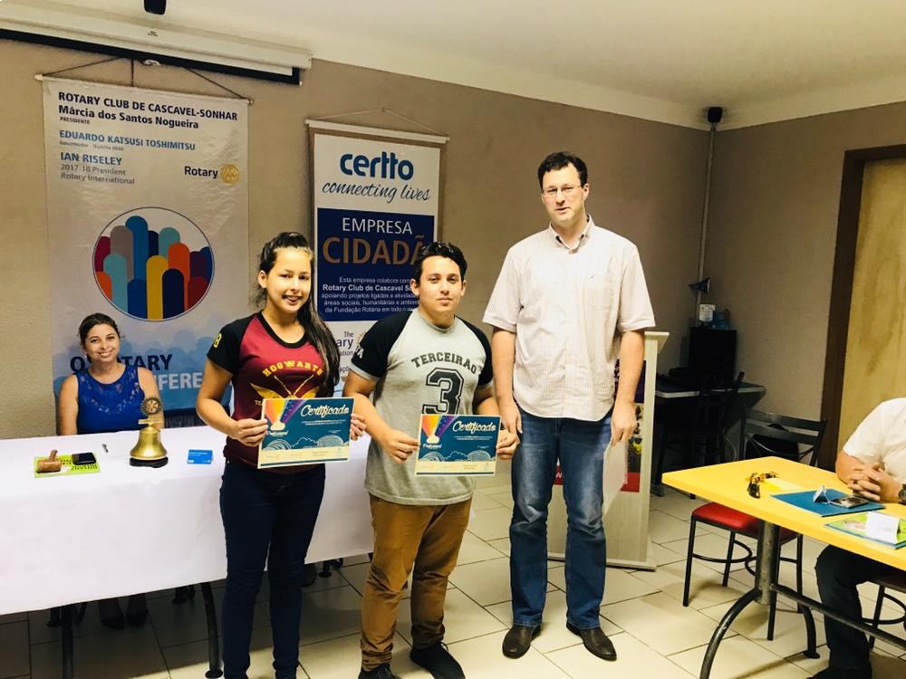 Na 17ª Reunião Ordinária do Rotary Club Sonhar, realizada em 13 de dezembro, o companheiro Nataniel Klug, membro da Comissão de Novas Gerações teve a honra de entregar a premiação para os estudantes Débora Ferreira (1ª colocada), Gabriel Mendes (2° colocado) e para Débora Pagliari ( 3ª colocada),classificados no concurso de redação realizado por este pelo Rotary Club, tendo como tema as aspirações profissionais dos jovens estudantes de terceiro ano do ensino médio do Colégio Estadual Brasmadeira. Na ocasião, em agradecimento pela acolhida dada aos estudantes, também foram homenageados os engenheiros Daniel Bordin, companheiro deste Rotary Club e o engenheiro Tiago Giacomel.