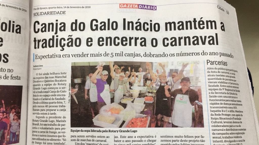 Na reunião ordinária de 20/02/2018, o Rotary Club de Foz do Iguaçu-Grande Lago, prestou contas da 18a Canja do Galo Inácio, que aconteceu no dia 13/02/2018.