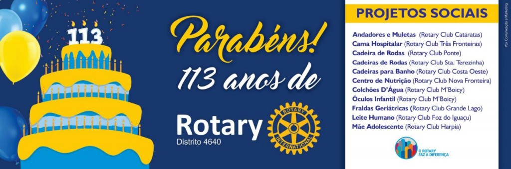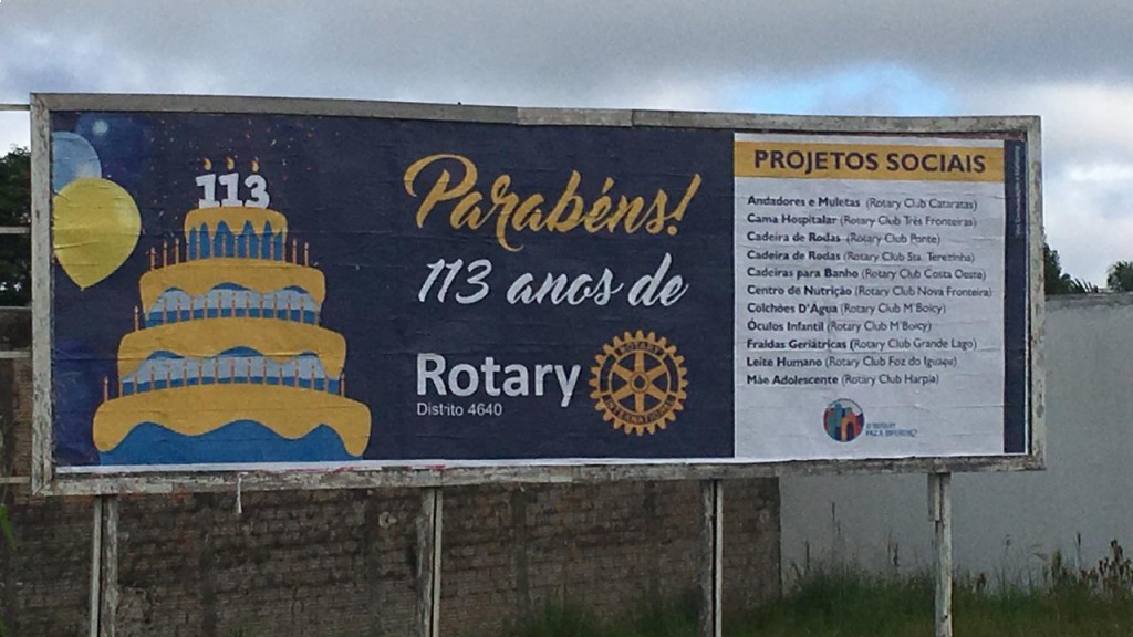 Os Rotary Clubs de Foz do Iguaçu e Santa Terezinha de Itaipu iniciaram as comemorações dos 113 anos de Rotary com 8 outdoors espalhados em toda a cidade divulgando os projetos e ações a sua comunidade.