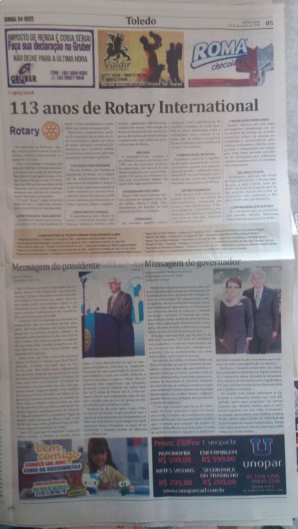 TRABALHO DE MIDIA REFERENTE AO 113 ANOS DO ROTARY INTERNACIONAL, ENTREVISTA RADIO GUAÇU , ROSALINO E RAPHAEL DO RC DE TOLEDO CENTENARIO + REPORTAGEM NO JORNAL DO OESTE
